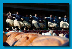 | Na Mele Hula 'Ohana triumphantly climaxes Aloha Festival '97 in San Francisco on August 17. The day began with a gifting ceremony in which Pacific Islanders presented a huge carved log (visible in the foreground of the photograph) to their "cousins", the Muwekma Ohlone, descendants of the original inhabitants of San Francisco. |