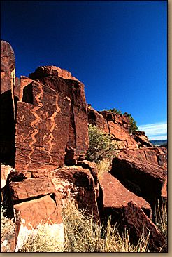 South of the Petroglyph National Monument , near the town of Mountainair, are the ruins of the Tenabo Pueblo. High on a ridge above the Pueblo is a striking, ten foot high petroglyph of Paired Horned Serpents.